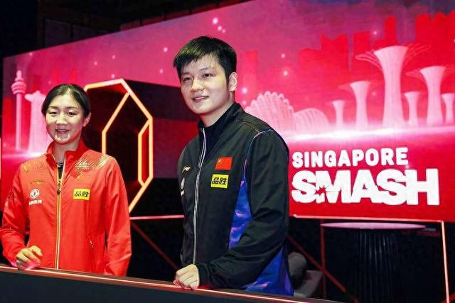 当地时间2023年3月9日,新加坡,2023WTT新加坡大满贯正赛抽签仪式举行。图为樊振东、陈梦出席抽签仪式。视觉中国供图
