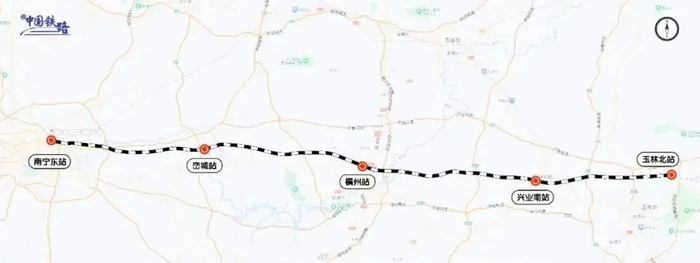 南珠高铁西起广西南宁市,东至广东珠海市,线路全长约648公里,设计时速350公里。此次开通的南珠高铁南玉段起自南宁东站,经南宁市、贵港市、玉林市,至玉林北站,线路全长193公里,设南宁东、峦城、横州、兴业南、玉林北5座车站,其中南宁东站为既有车站,其余为新建车站。