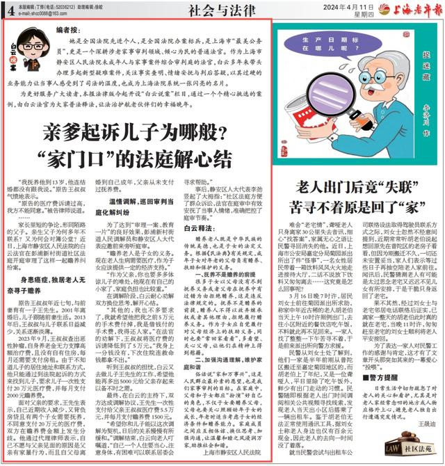 这些都是老年人日常会遇到的实际问题。今年4月,在上海市高级人民法院的指导下,上海市静安区人民法院联合《上海老年报》开辟了《白云说案》专栏( 点击查看详情),针对赡养纠纷、监护纠纷、相邻关系、婚姻家事、旅游合同、医疗损伤等涉老民事审判中常见的法律问题,每月选取典型案例,采取以案释法、法官评案的方式,用通俗的语言、专业的视角,将丰富的法律知识“送”到老年人身边。