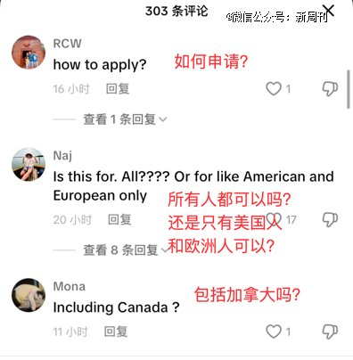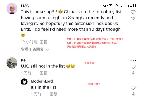 政策一发出,迅速在海外短视频平台TikTok上引发了热烈的讨论。有外国网友火速分享了这一好消息,不少网友都在评论区认真询问,自己所在的国家是否在名单上。其中不少“暖心发言”。