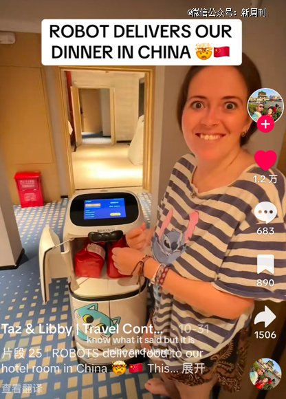 “机器人能将食物送到我们的房间,这太疯狂了!”在一则视频里,博主@Taz&Libby在面对酒店的机器人送餐时不禁大喊。