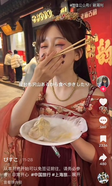 在美食和美景之外,也有外国人被中国的文化吸引。几天前,一位日本博主来到了上海,在豫园体验了汉服写真,品尝了当地的小笼汤包,并在视频里接着新的免签政策向网友们“安利”:“请务必要来体验”。