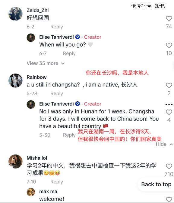 在视频里,她兴奋地说:“我结识了一群超棒的同行伙伴,品尝了一些令人赞不绝口的美食,也看到了美不胜收的风景!”在评论区,她回复询问的中国网友:“我会再回到中国!你们的国家真美。”