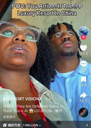 没人能在中国的景色面前做好“表情管理”。博主@passport visionz是一对旅居中国两年的美国黑人夫妇。他们的视频常常以两个人的震惊脸画面开始,接着介绍中国的各处场景。