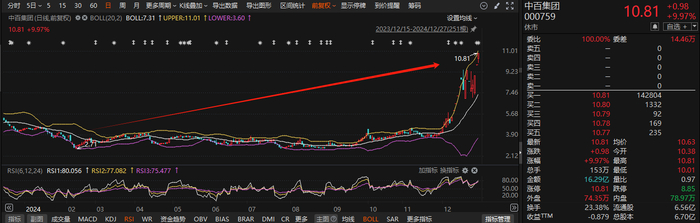 总市值超600亿元的零售龙头永辉超市12月18日公告,2024年12月3日至2024年12月17日期间,全资子公司重庆永辉通过集中竞价方式累计出售中百集团共计6710.1287万股,占其股本的9.87%。出售金额约为4.4亿元,初始投资成本为4.86亿元,本次出售将增加2024年投资收益约为1.61亿元,上述股权累计确认投资收益约为-0.46亿元。截至公告日,公司及下属子公司不再持有中百集团A股股票。二级市场上,中百集团12月13日收盘斩获5连板,2月低点迄今股价累计最大涨幅达299%。