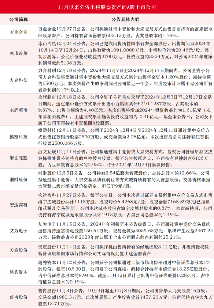 据财联社不完全统计,截至发稿,11月迄今包括万业企业、冰山冷热、力合科创、永辉超市、模塑科技、浙文互联、湘财股份、宏达高科、艾为电子、天宸股份、越秀资本、普冉股份在内的12家A股上市公司公告出售股票资产计划或进展,具体情况如下图: