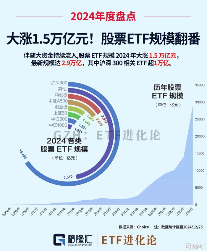股票型ETF规模飙升,截至2024年12月25日其总规模为2.9万亿元,比去年增长1.5万亿,增长幅度104%。