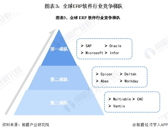 目前,全球ERP软件的龙头企业主要是SAP、Oracle和Infor等企业,占据了全球ERP软件超过一半的市场份额。第二梯队是Deltek、Workday和Abas等,近年来在ERP软件市场发展迅速。第三梯队为Vantis、CAC等小型的ERP软件企业。