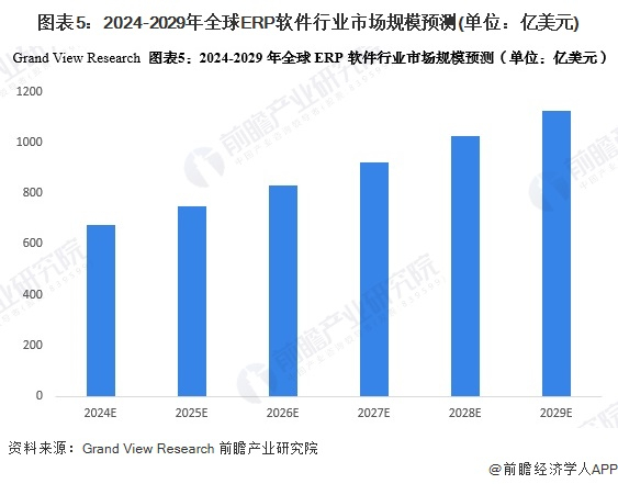 随着企业对提高生产经营效率的需求持续增长,以及ERP软件技术的不断发展,全球ERP软件市场规模或持续增长,根据Grand View Research的预测,预计2024-2029年全球ERP软件市场将以11%的复合增长率增长。到2029年全球ERP市场规模将达到1126亿美元。