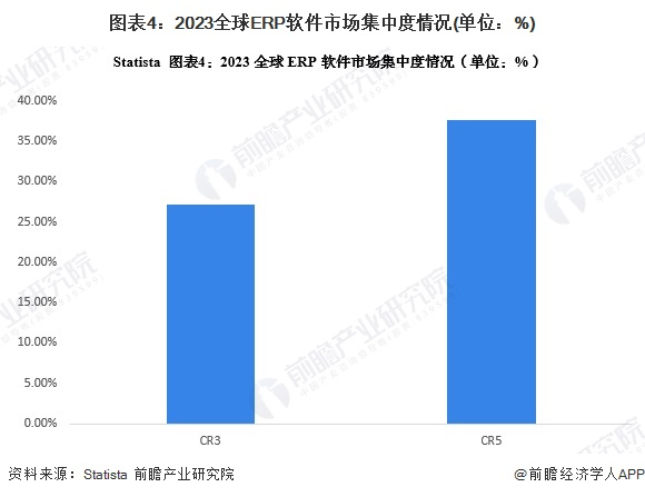 过去10年,全球ERP市场竞争格局相对稳定,其中SAP、Oracle份额基本稳定在前2。近年来,随着Microsoft Dynamics的发布,微软快速进入市场,并占据了一定的市场份额。根据Statista公布的市场集中度来看,2023年全球ERP市场的CR3为27.16%,CR5为37.62%,说明整体市场集中度一般,行业竞争较为激烈,但头部企业的竞争优势明显,所占市场份额较高。