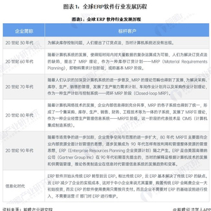 20世纪30年代至今,全球ERP软件的发展从一开始的订货点法,到MRP理论的推出,再到如今广泛应用的ERP软件,全球ERP软件经历了漫长的发展阶段。