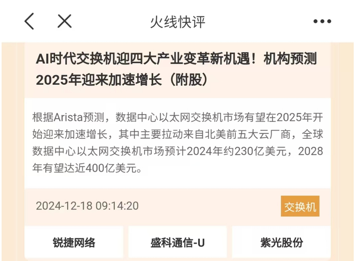 在近期,“火线快评”提到了AI服务器的这个主线。比如在12月18日开盘前,“火线快评”提到了交换机板块,相关个股锐捷网络累计上涨50%。