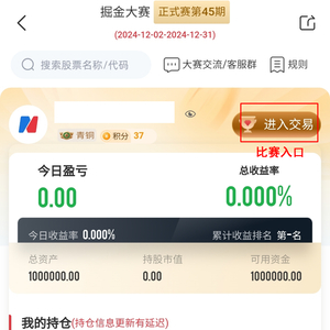 需要提醒的是,最近一些选手把训练营当成了比赛,在掘金大赛首页的“模拟交易”栏目中,这是训练营入口。点击掘金大赛的右上角“进入交易”,这才是比赛入口。