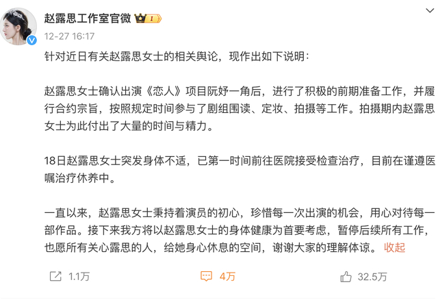 当日下午,赵露思工作室发文回应赵露思身体情况——