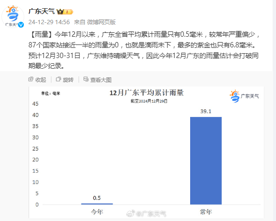 至于降水,2024年的最后几天,全国大部地区雨雪继续“迷路”中……像广东,12月以来,接近一半的国家级气象观测站雨量为0,也就是滴雨未下。