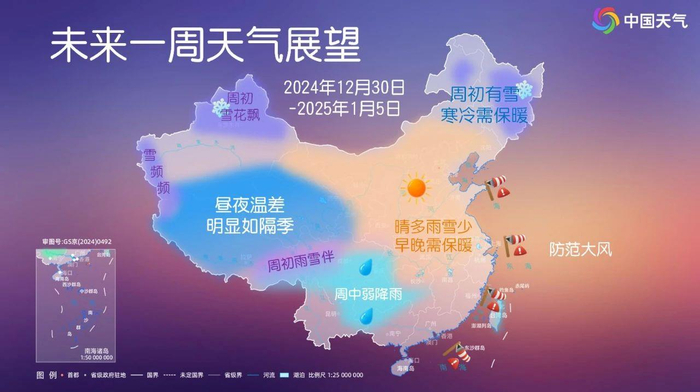 2025年1月1日至3日,虽然有冷空气影响中东部地区,北方部分地区降温4℃至6℃,不过也难以改变气温偏高的格局。一图看清下周天气↓