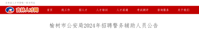 近日,吉林人才网发布《榆树市公安局2024年招聘警务辅助人员公告》,面向社会公开招聘警务辅助人员共计200人。具体内容如下: