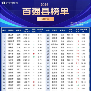 最新中国百强县排行榜 VC/PE/MA金融圈 2024.12.2923:59 关注 昆山市以GDP5140.6亿元稳居百强县榜首,GDP增速由1.8%提高至5%,亚军江阴市紧随其后GDP接近5000亿。企业预警通依据最新发布,更新如下:一、GDP