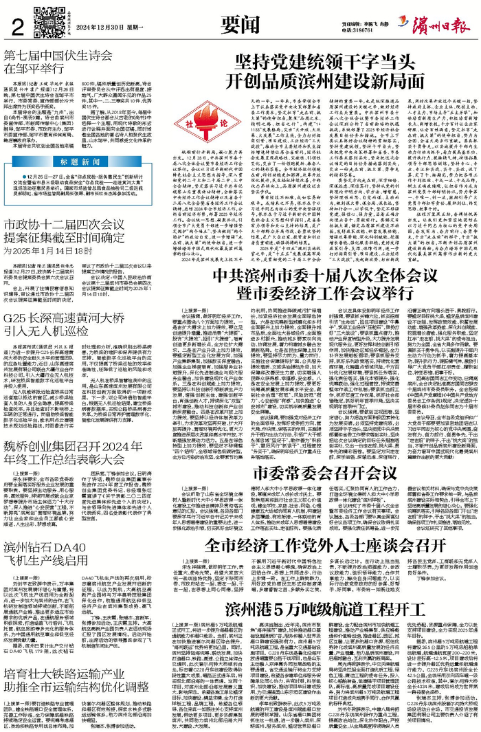 2025年是“十四五”规划实施收官之年,是“十五五”发展谋篇布局之年,是贯彻党的二十届三中全会精神的重要一年,也是纵深推进品质滨州建设的关键之年,做好经济工作至关重要。中共滨州市委十届八次全体会议暨市委经济工作会议深刻分析了当前面临的机遇挑战,系统部署了2025年经济社会发展目标任务和措施。全市上下要认真抓好会议精神的贯彻落实,坚持党建统领,坚持干字当头,坚决把党中央决策部署和省委、市委工作要求落到实处,坚决把这次会议确定的目标任务措施落到实处,交出一份走在前、挑大梁、勇争先的精彩答卷。