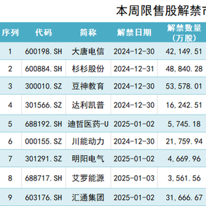 元旦假期临近,本周A股市场交易时间缩短至四个交易日,限售股解禁规模降至不到330亿元,且呈现分散态势。