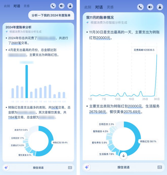 目前,除了暖心总结,支小宝也可以对你的全年账单进行分析和提炼,提醒你几月的支出最高、哪一类的消费最多。想了解上个月或上周的账单情况,也可以让支小宝帮你总结。