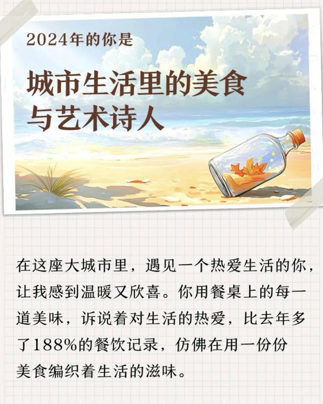 橙柿互动记者去试了试,比去年多了188%的餐饮美食记录,还有文化休闲超越了90%的人群,这两个数据被总结为2024年的我,是“城市生活里的美食与艺术诗人”,看完让人忍不住嘴角上扬。