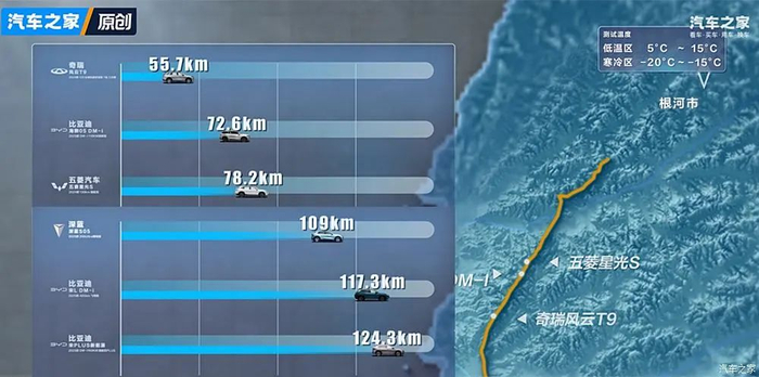 寒冷区续航测试由呼伦贝尔陈巴尔虎旗穿越到冷极根河,挑战寒冷区双城往返,全程经过50%的高速工况以及50%的低速工况,测试当天温度为-20℃到-15℃。在出发前,我们将所有车辆充满电,选择最经济的驾驶模式,小计里程清零,空调23°C风量自动,并在车内放置温度计,一切确认无误后,续航测试正式开始。