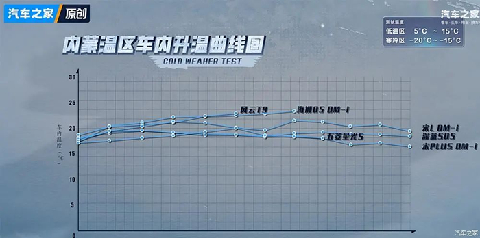 接着我们再看看车内温度舒适性,出发时所有车辆车内温度均在17度左右,在行驶10分钟后,五菱星光S温度只提升了0.3度,但其它5辆车内温度均接近20度了,其中,深蓝S05,宋L DM-i和宋PLUS整个最高温度也就20度左右,但海狮05和风云T9能升温至设定的23度,更舒服,也能是他俩续航较短的原因