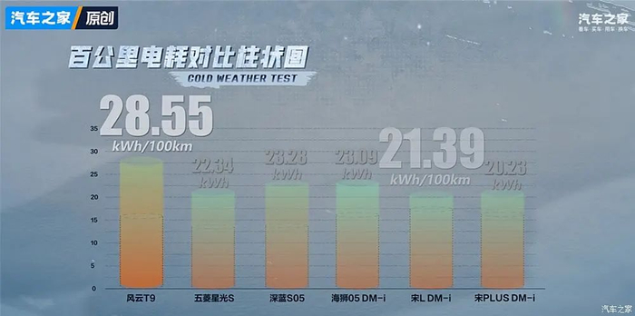 在得出了充入电量后,我们最终得到了本组每百公里电耗的表现,宋L DM-i的百公里电耗为21.39kwh,表现最好,风云T9则最高,百公里电耗为28.55kwh。电耗与低温区相比,表现最好的也是宋L DM-i,只比低温区多了4.03kWh/100km。不太理想的是风云T9,能耗增加了13.1kWh/100km。