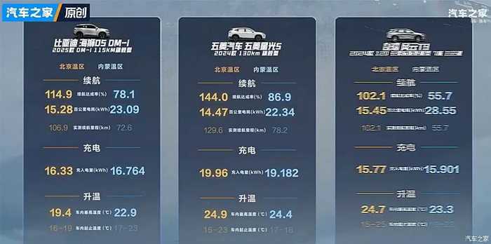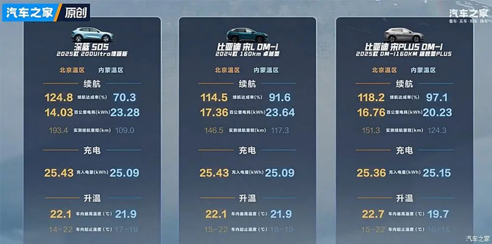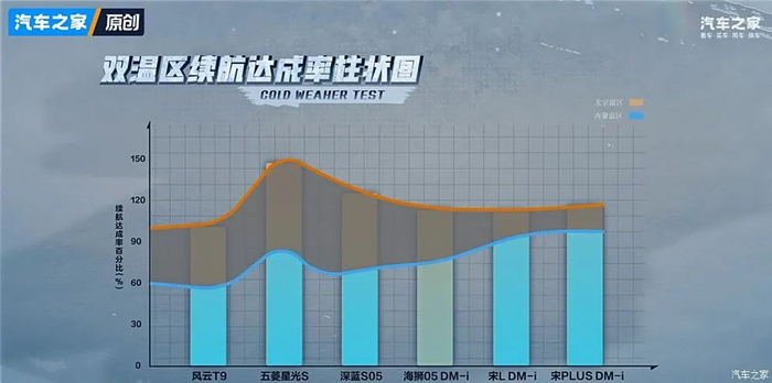 与低温区的纯电成绩相比,一下就看出了问题。风云T9的达成率直接从102.1%降到了55.7%,缩水了46.4%。不过五菱星光S最不抗冻,在低温区拿下了144%最好达成率,但在寒冷区缩水了57.1%。深蓝S05也同病相怜,双温区达成率少了54.5%。这三台比亚迪就比较淡定了,海狮05 DM-i达成率缩水36.8%,宋L DM-i缩水22.9%,宋PLUS DM-i缩水21.1%。这宋家族两兄弟继续稳拿冠亚军。