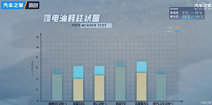 馈电油耗与低温区相比,宋L DM-i,深蓝S05,五菱星光S均增加了2L多,五菱星光S最高,增加了2.5L/100km,然后海狮05 DM-i、风云T9、宋PLUS DM-i馈电油耗增加都不到1L,海狮05 DM-i增加0.96L/100km,风云T9增加0.72L/100km。