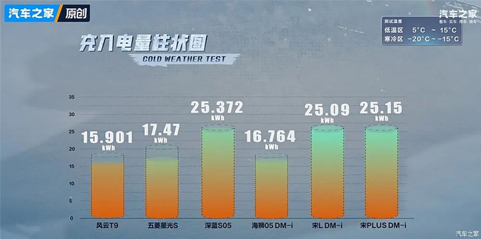 虽然混动车型不会将电量用尽,剩余电量也有差异,充入电量也各不相同。我们直接拿双温区做对比,风云T9,海狮05 DM-i在寒冷温区比低温区多充入电量,但差别不大。而宋L DM-i,五菱星光S、深蓝S05则比低温区充电量更少了。