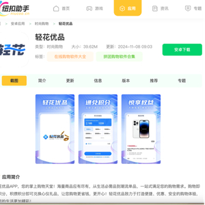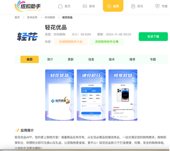 在一些小的应用商城中,轻花优品直接伪装成积分购物平台,实际上却开展借款业务。比如纽扣助手网站显示,轻花优品自我介绍第一条是打开软件,首页即可查看积分余额和可兑换商品;但为第二条即为:进入“钱包”页面,尝试借款功能,平台会提供专业的借款攻略,帮助您轻松获得积分。