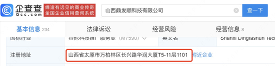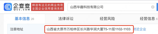 第三条是,轻花优品的运营公司华趣科技,注册地址为“山西省太原市万柏林区长兴路华润大厦T5-11层1102-1103”,而核心人物崔丽嘉担任监事的“山西鼎发顺科技有限公司”,注册地址则“山西省太原市万柏林区长兴路华润大厦T5-11层1101”,即两家公司在同一栋楼、同一楼层的隔壁。