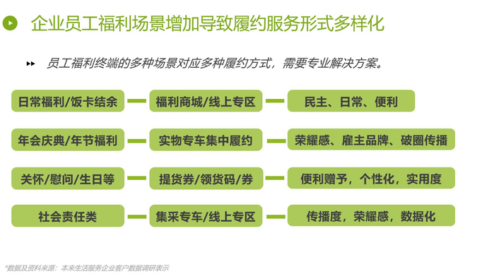 在选品八大趋势之外,根据企业营销礼和福利的多样化发展、需求场景的增加,本来生活同步总结了相配套的履约服务形式,将其分为几个主要类别,并为每个类别提供了相应的解决方案。