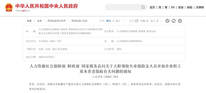 人力资源社会保障部、财政部、国家税务总局联合印发《关于大龄领取失业保险金人员参加企业职工基本养老保险有关问题的通知》。