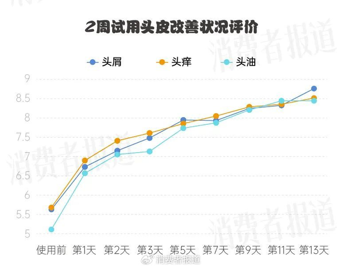 头屑的评分使用前为5.6分左右,24小时(第一天)就能提升到6.7分,48小时和72小时稳定为7.1分和7.5分,2周后的评分为8.7分,盖上效果明显。头痒评分也在24小时内从5.7分好转为6.9分,48小时为7.4分,2周后的分数稳定为8.5分。控油效果也不错,头油评分从使用前的5分左右,24小时提升到6.5分,2周为8.5分。