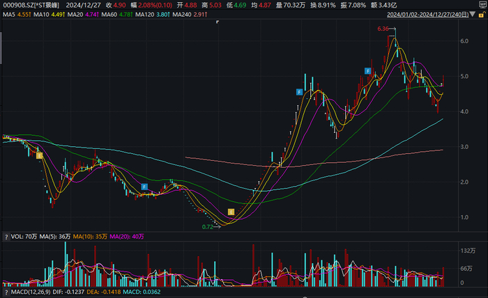 1月初,*ST景峰股价还在3元/股之上,随后股价一波三折下行,在年中之时最低下探至0.72元/股。触底后便是一波反弹走势,一路拉升至最高6.36元/股,区间最高涨幅约780%。公司最新收盘价在4.90元/股,最新市值43亿元。