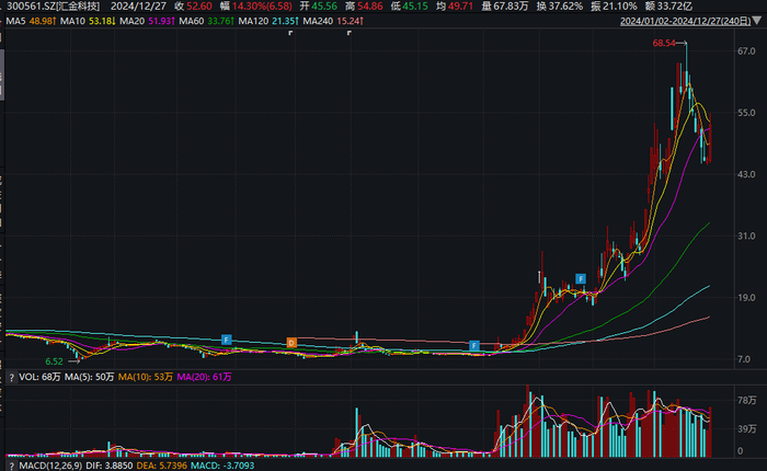 汇金科技行情自9月6日启动,至12月12日股价累积涨幅约700%。股价从8元/股附近涨至超过60元/股,最新收盘价仍有52.60元/股,总市值173亿元。