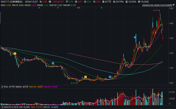 在近五个交易日中,岭南股价已开始回落,且连续出现三个跌停。公司最新股价3.88元/股,最新市值71亿元。