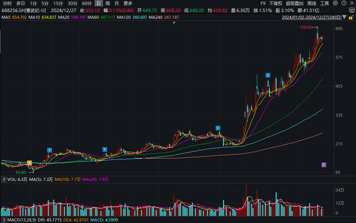 寒武纪-U股价还在创新高的过程中。年初,其股价134.96元/股,近期盘中一度触及700元/股,最新收盘价652.10元/股。如今,公司已成为A股市场上,仅次于贵州茅台(600519.SH)的高价股。