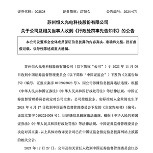 同日,ST恒久及相关人员收到江苏证监局警示函。经查,公司存在未就对外财务资助事项及时履行信息披露和监督管理义务、光导鼓外销业务内部控制存在缺陷、内部交易中存货相关财务核算不规范以及关联交易未披露等事项。
