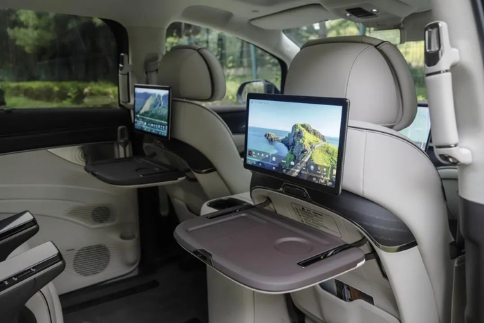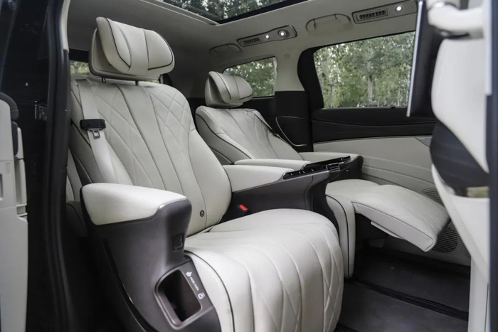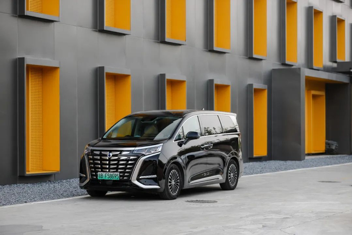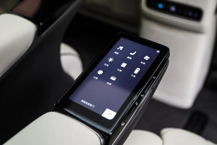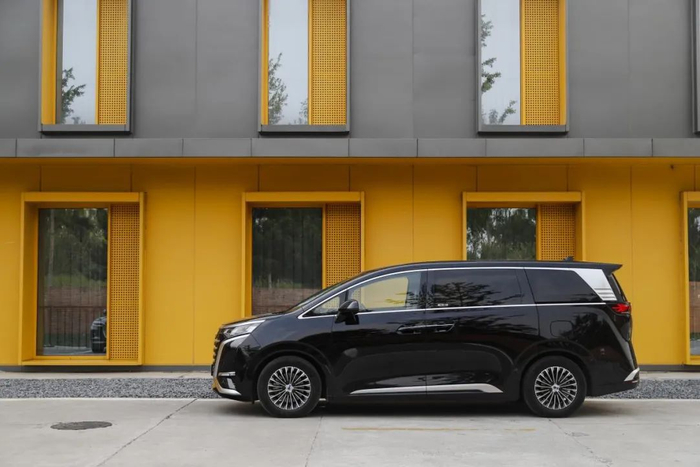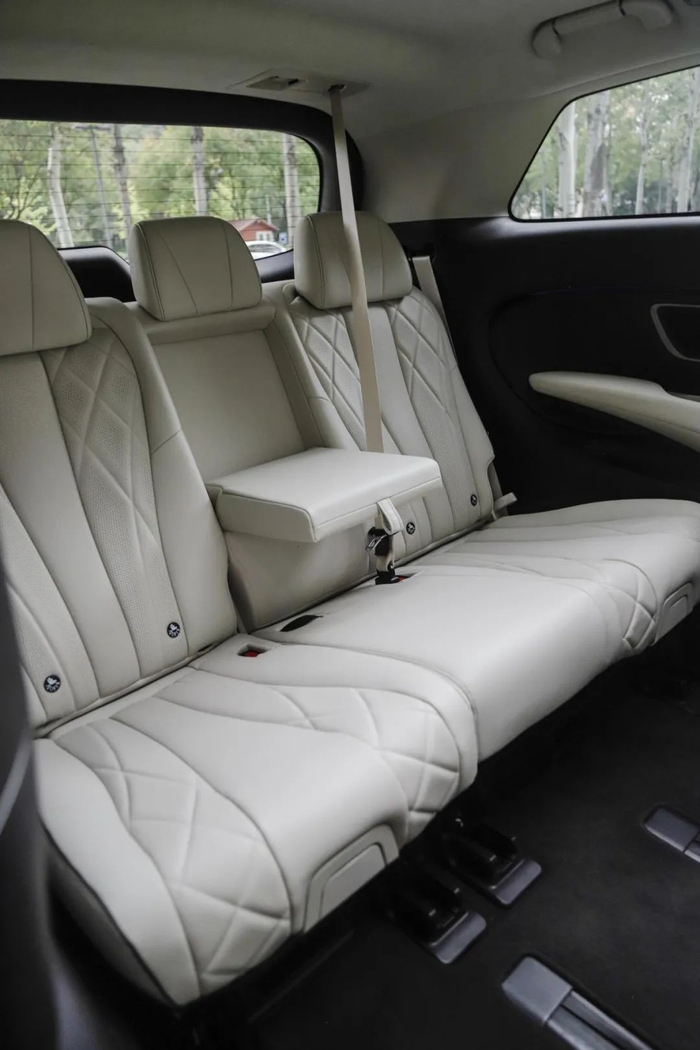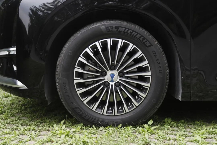 18 英寸的多辐条轮辋搭配的是米其林 e·Primacy 轮胎。这是一款面向高端紧凑型电动车的轮胎产品,主打静音舒适性和节能性,对 MPV 来说是个不错的选择。车尾简洁方正,贯穿式剑羽状尾灯十分醒目,再配上底边的银色饰条,看上去十分稳重。这个设计师看来非常懂中式审美。电吸门在 MPV 车型中真的很少见,优雅感一下子就提升了起来。本应该是亮点的四门无钥匙进入,相比之下就普通了些。第二排地台高度在正常范围内,不会对老人和小孩上下车造成不便,上车用的扶手要是再长一点就能照顾到更多人。