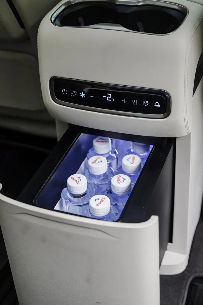 MPV 的座椅堪称真正的 “大沙发”,腾势 D9 的座椅依然非常舒适。此次升级对副驾有所照顾,新增了座椅高低调节和四向腰部调节。第二排座椅的前后调节和靠背角度调节,相信是听取了老用户的意见,从屏幕操作变为实体按键,方便了许多。小桌板全系标配,上面的几处小限位槽也是精心设计。冰箱不再是之前的半导体保鲜,而是采用压缩机制冷,温度从 - 6℃可上升至 50℃,制冰和加热都不在话下。