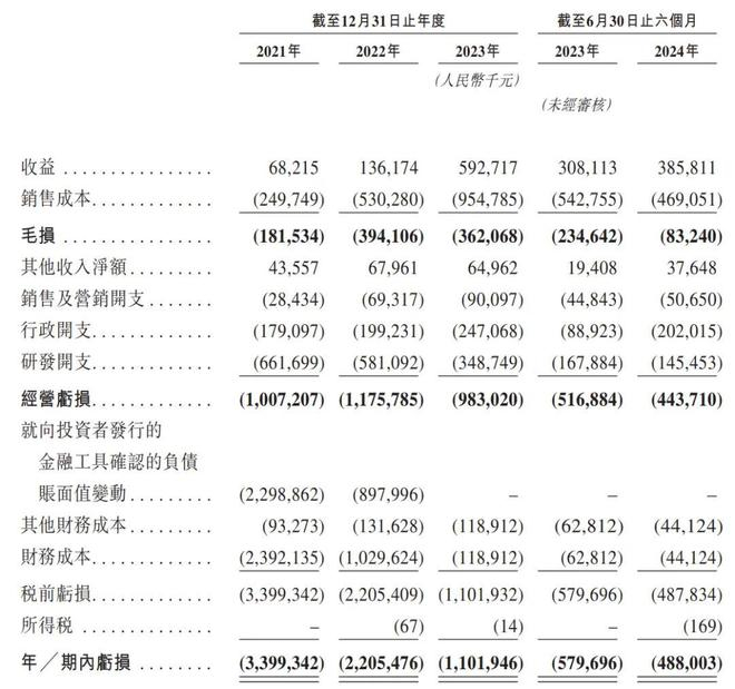 招股书显示,英诺赛科2021年、2022年、2023年营收分别为6821.5万元、1.36亿元、5.93亿元;毛亏损分别为1.82亿、3.94亿、3.62亿元;运营亏损分别为10亿元、11.76亿元、9.83亿元;期内亏损分别为34亿元、22亿元、11亿元。