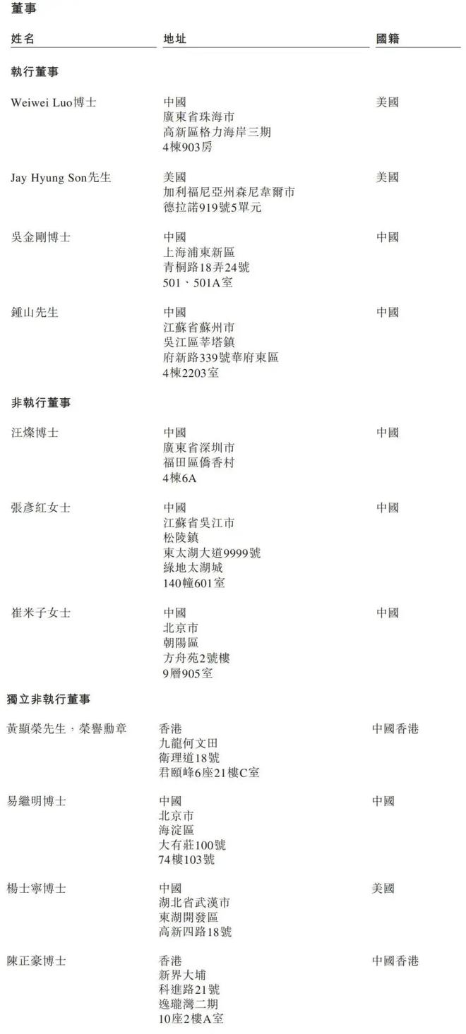 英诺赛科执行董事分别为WeiweiLuo博士、Jay Hyung Son、吴金刚博士、锺山;非执行董事分别为汪灿博士、张彦红女士、崔米子女士;独立非执行董事分别为黄显荣先生,荣誉勋章、易继明博士、杨士宁博士、陈正豪博士。