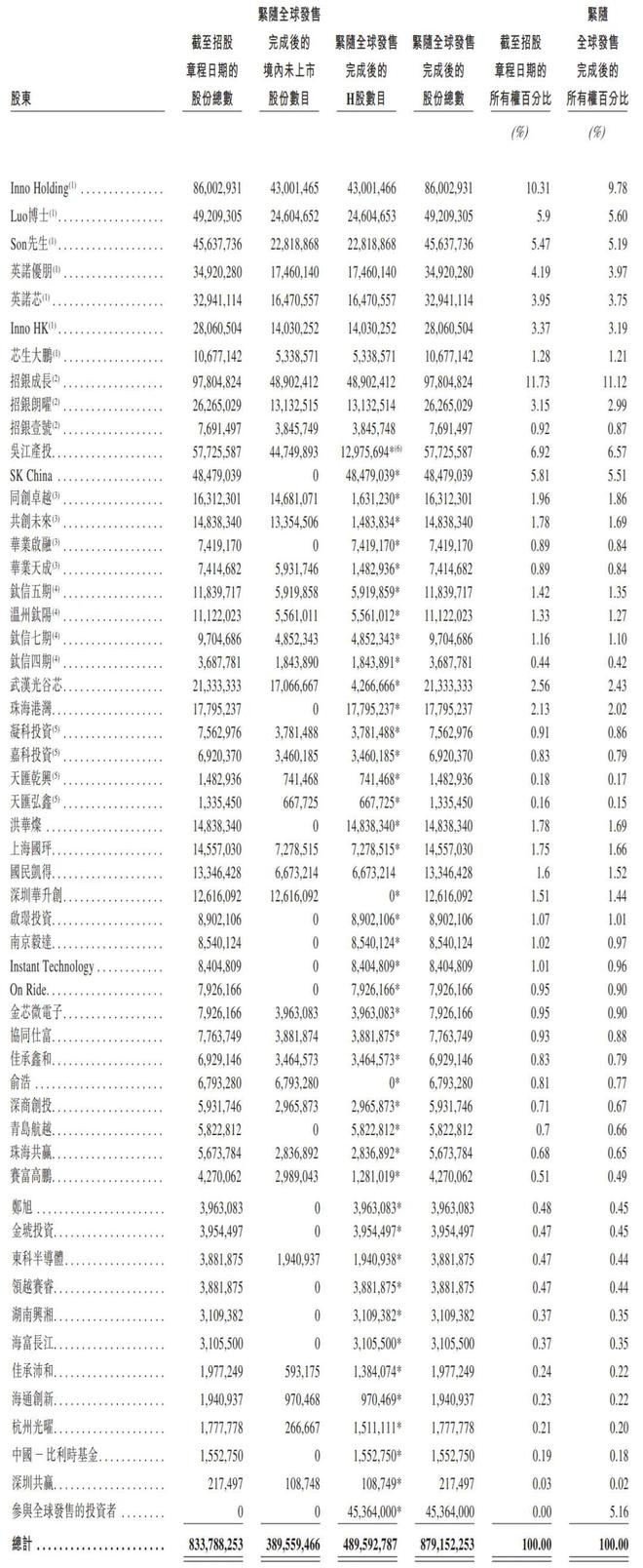 IPO后,InnoHolding持股为9.78%,Luo博士持股为5.6%,Son持股为5.19%,英诺优朋持股为3.97%,英诺芯吃为3.75%,Inno HK持股为3.19%,芯生大鹏持股为1.21%。