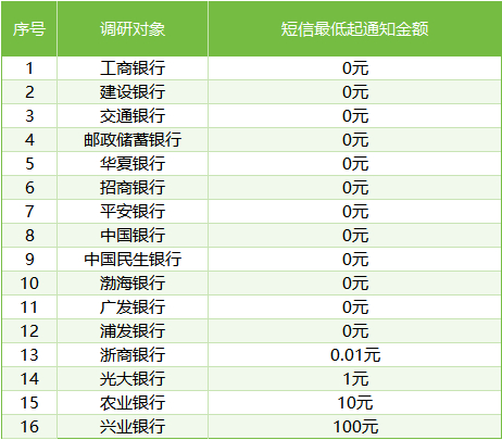 除宁波银行和恒丰银行外,其余银行均提供借记卡小额动账短信通知服务。