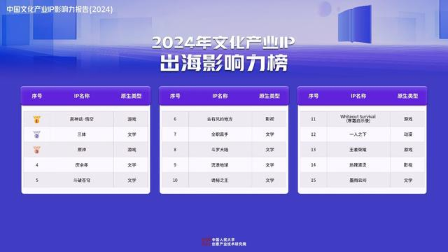 为客观评价IP的国际影响力和对传播中华文化的贡献度,为国际化业务拓展提供参考,《报告》还增设IP出海影响力榜,遴选了成功出海、具有广泛影响力且对中华文化传播作出突出贡献的15个IP,《黑神话:悟空》《三体》《原神》《庆余年》《斗破苍穹》位列前五。值得注意的是,上榜IP超过50%的原生类型依然是文学。