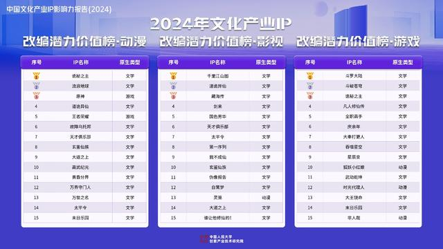 《中国文化产业IP影响力报告》发布:网文占比高,影漫游改编潜力大